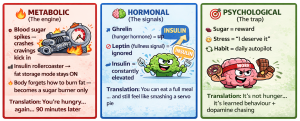 👉 Refined carbs + sugar = fast dopamine hit 👉 Your brain goes: “That’s good… do that again” 👉 Repeat it enough = you’re not choosing it anymore… it’s choosing you